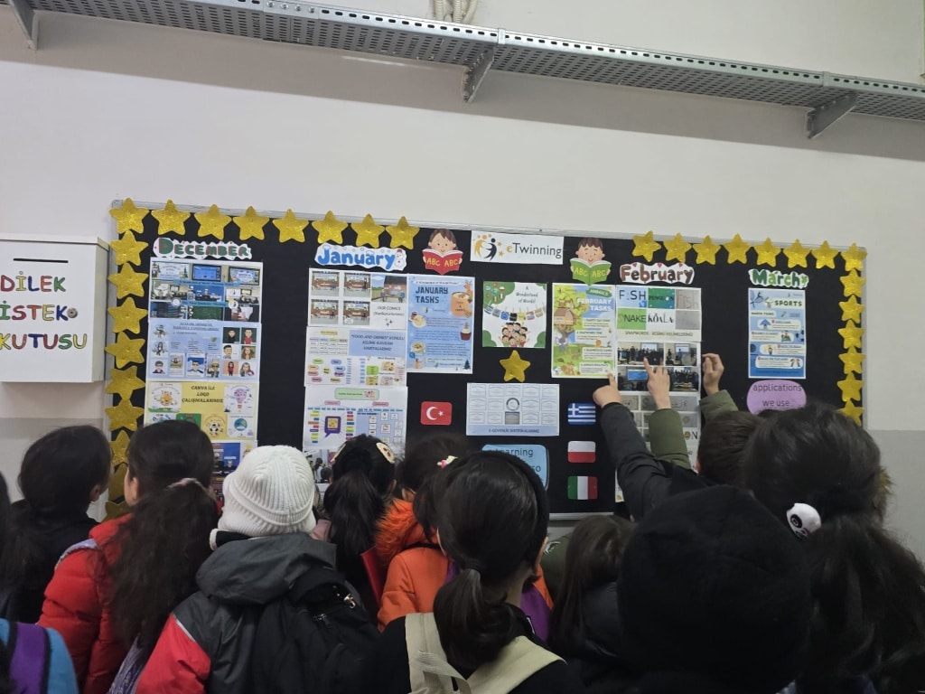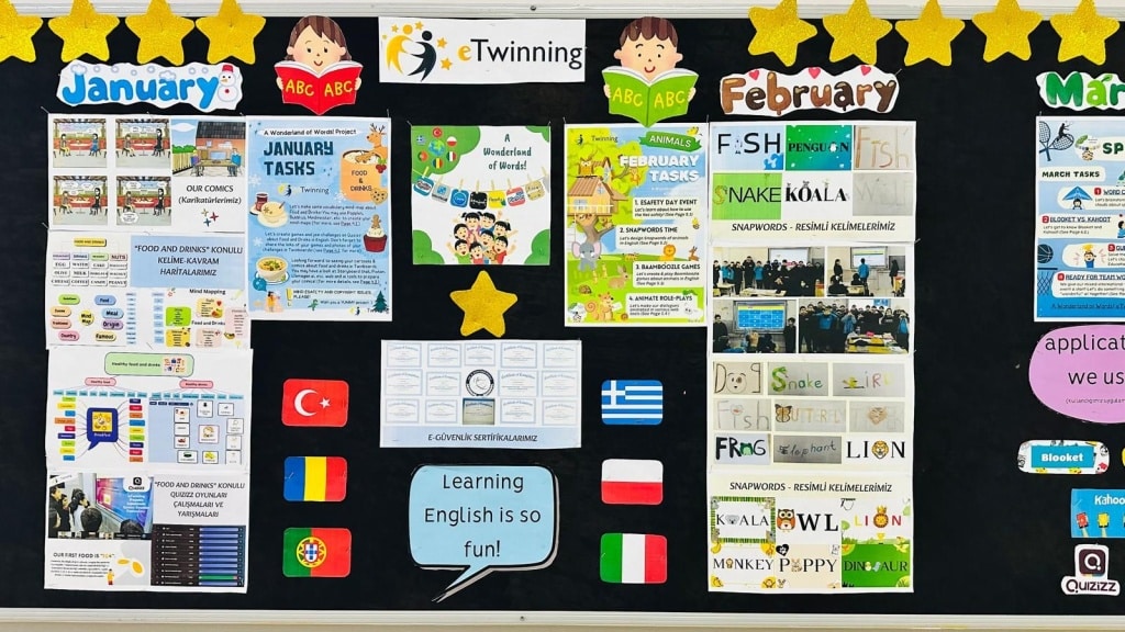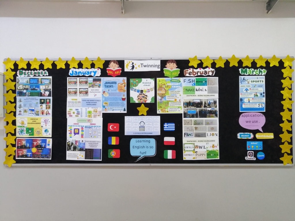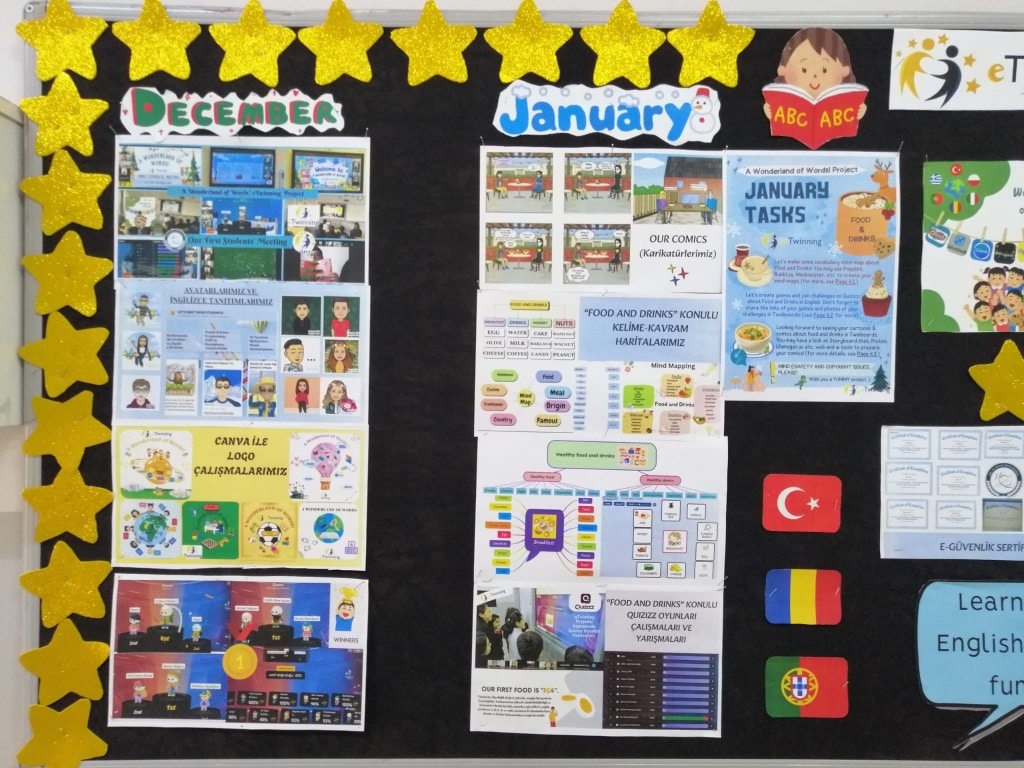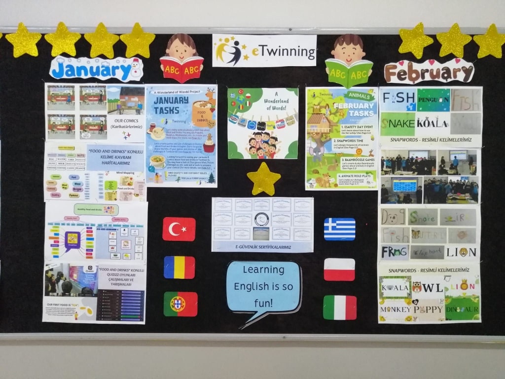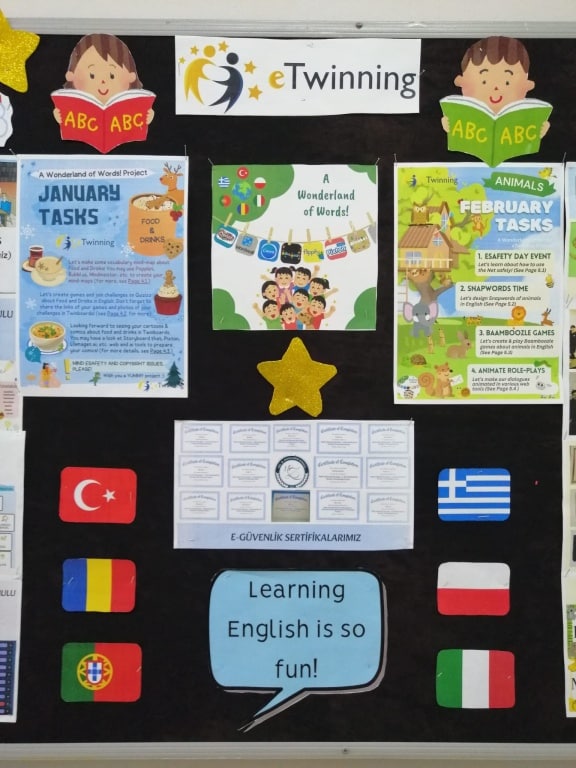 A Wonderland of Words! (Kelimeler Diyarı) eTwinning projemiz kapsamında 6-G sınıfından Arya, Ayşe, Ceylin, Betül ve Merve isimli öğrencilerimiz, Aralık ayından bu zamana kadar Avrupa ve Türkiye’den kardeş okullarımızla ortak olarak yürüttüğümüz proje etkinliklerinin bilgi ve sunum panosunu hazırladılar. Siz değerli öğrencilerimiz de okul içinde panomuzu ziyaret edebilir ve proje çalışmalarımız hakkında daha detaylı bilgi alabilirsiniz