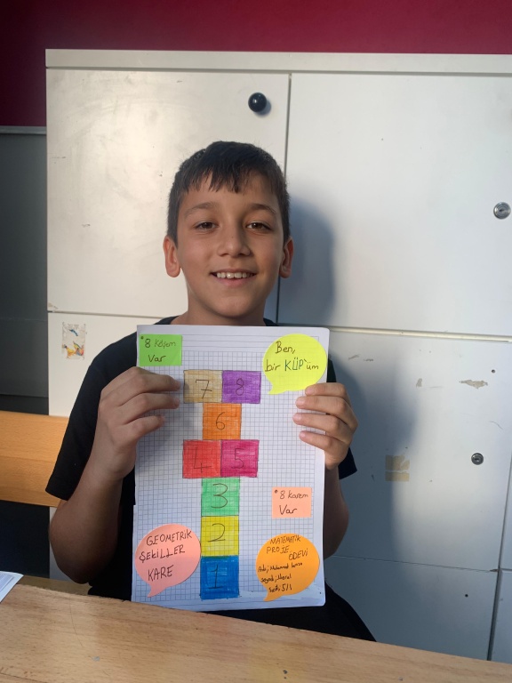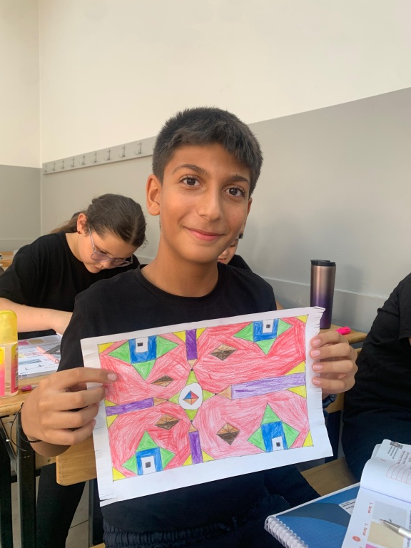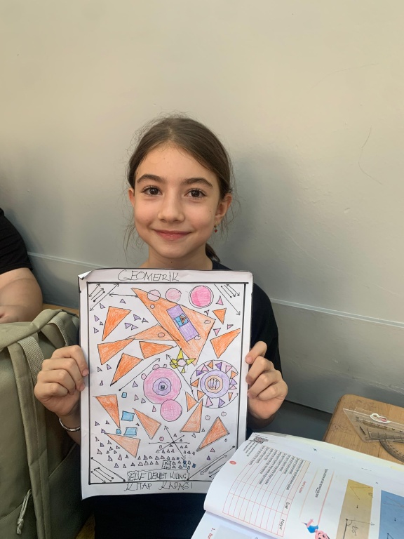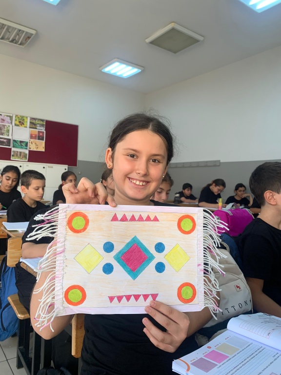 5.sınıf öğrencilerimiz Matematik dersinde Türkiye Yüzyılı Maarif Modeli kapsamında ilk performans görevini gerçekleştirdi. “Tasarım Yapıyorum” etkinliğinde öğrencilerimiz öğrendiği geometrik şekiller ile halı, kilim, kitap kapağı, logo gibi tasarımlar yaptılar.