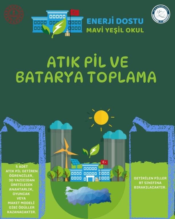 Okulumuzda uygulanmaya başlayan Mavi Yeşil Okul Projesi kapsamında atık pil toplama kampanyası başlatılmıştır. Geleceğe mavi yeşil bakmak isteyen, enerji dostu olan herkesten kampanyamıza destek bekliyoruz.